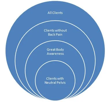 The largest circle incorporates everyone that could walk through the door. But the first people I’m going to eliminate from swings are those that have a history of lower back pain. For a variety of reasons, long time back pain sufferers have a hard time repeating a great hip hinge. If someone can’t do that unweighted – never mind under a ballistic load – they’re in for tough times. That doesn’t mean they’ll never swing, but they’ll have additional hoops to get through.