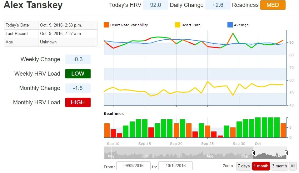 To the right is a screenshot of my own HRV scores, and you can see the slow, downward trend as well as the “High” monthly load sign. The nine point spike I had just before I became symptomatic is also explained with research on the topic, as your body attempts to make itself more parasympathetic during the incubation phase. But beyond that, HRV has made me understand my body better and illustrate that everything matters.
